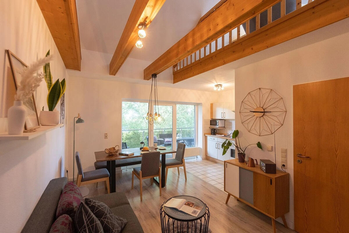 Die moderne 2-Zimmer-Galerie-Wohnung bietet Platz für 4 bis maximal 6 Personen, verfügt über einen Balkon, einen gemütlichen Wohnbereich mit Küche, eine darüberliegende Galerie sowie ein separates Schlafzimmer.